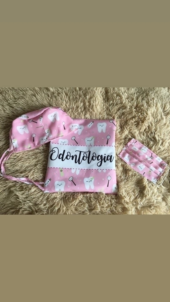 Porta Jaleco medindo 28cm x 28cm, touca confeccionada em Oxford 100% poliéster, máscara confeccionada em tricoline 100% algodão e 100% poliéster a parte estampada.