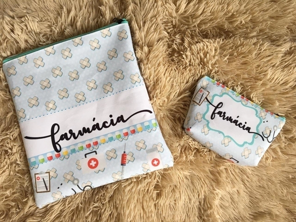 Porta jaleco tamanho 28cm x 28cm, necessaire 13cm x 18cm.