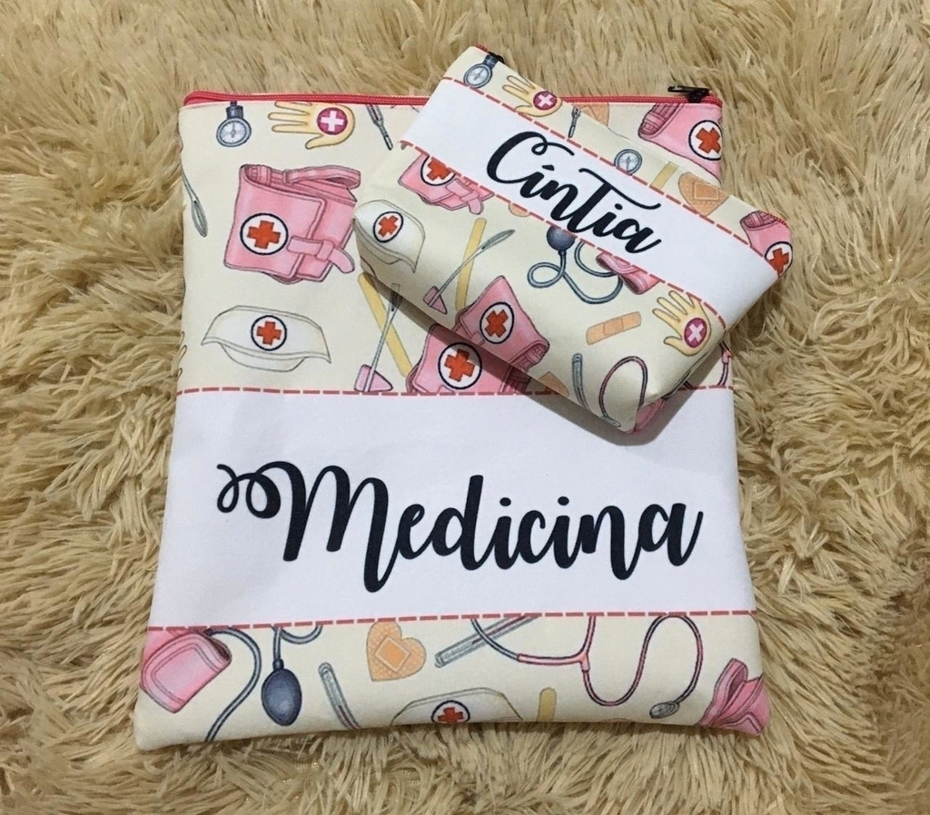 Porta jaleco tamanho 28cm x 28cm, necessaire 13cm x 18cm. Para personalização do nome, após a compra nos envie o nome que vai ser personalizado por meio da plataforma de WhatsApp disponivel no nosso site.